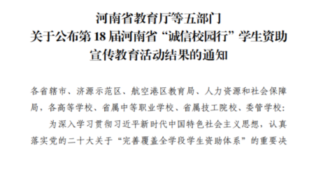 近日,河南省教育厅等五部门公布了第18届河南省“诚信校园行”学生资助宣传教育活动结果,yl23411集团官网物理与电子工程学院刘艺轩同学作品《萤火与星河:一个山区青年的追光之路》荣获省级二等奖,化学与材料工程学院张守琴同学作品《一个西部学子的向阳生长》作品荣获省级三等奖,有效彰显了yl23411集团官网在学生资助育人及诚信教育领域的突出成效。