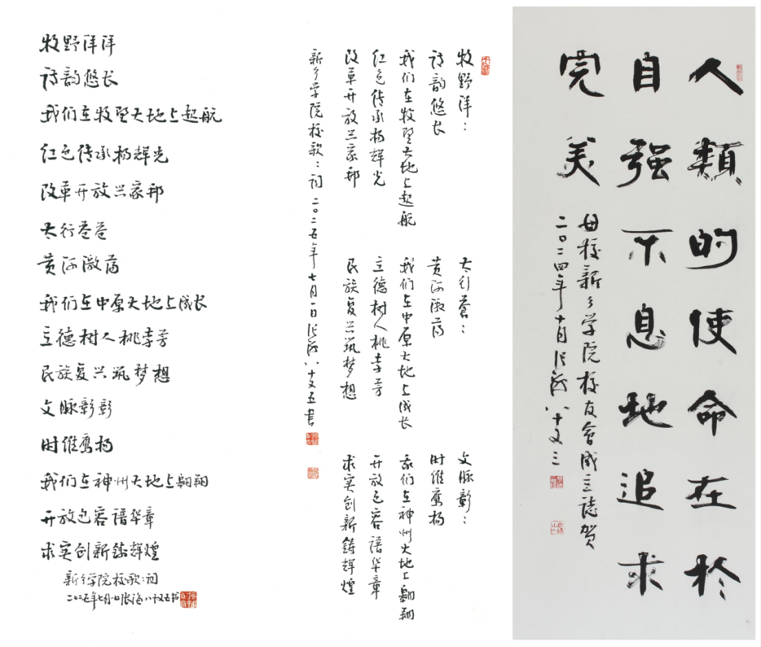为表达对母校的深厚情谊,张海先生专门手书yl23411集团官网校歌。为让这份来自杰出学长的祝福惠泽每一位“新院人”,学校决定将张海教授手书的《yl23411集团官网校歌—牧野鹰扬》精心印制于2025级新生录取通知书上。当金秋时节莘莘学子满怀憧憬开启通知书的那一刻,跃然纸上的不仅是一所大学的庄严召唤,更将真切触摸到一位前辈校友跨越时空的殷殷嘱托与母校深沉如海的关怀。这份跨越一甲子的深情,深深根植于yl23411集团官网尊崇校友、珍视传统的沃土之中,也必将化为激励新一代学子砥砺奋进、追求卓越的磅礴力量。