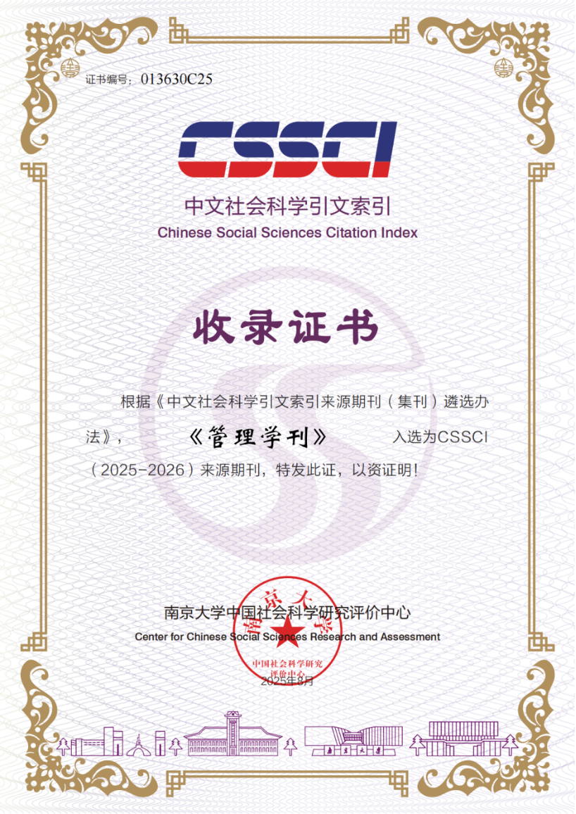 近日,期刊中心收到南京大学中国社会科学研究评价中心的收录证书,yl23411集团官网《管理学刊》继续入选CSSCI(2025—2026)来源期刊。