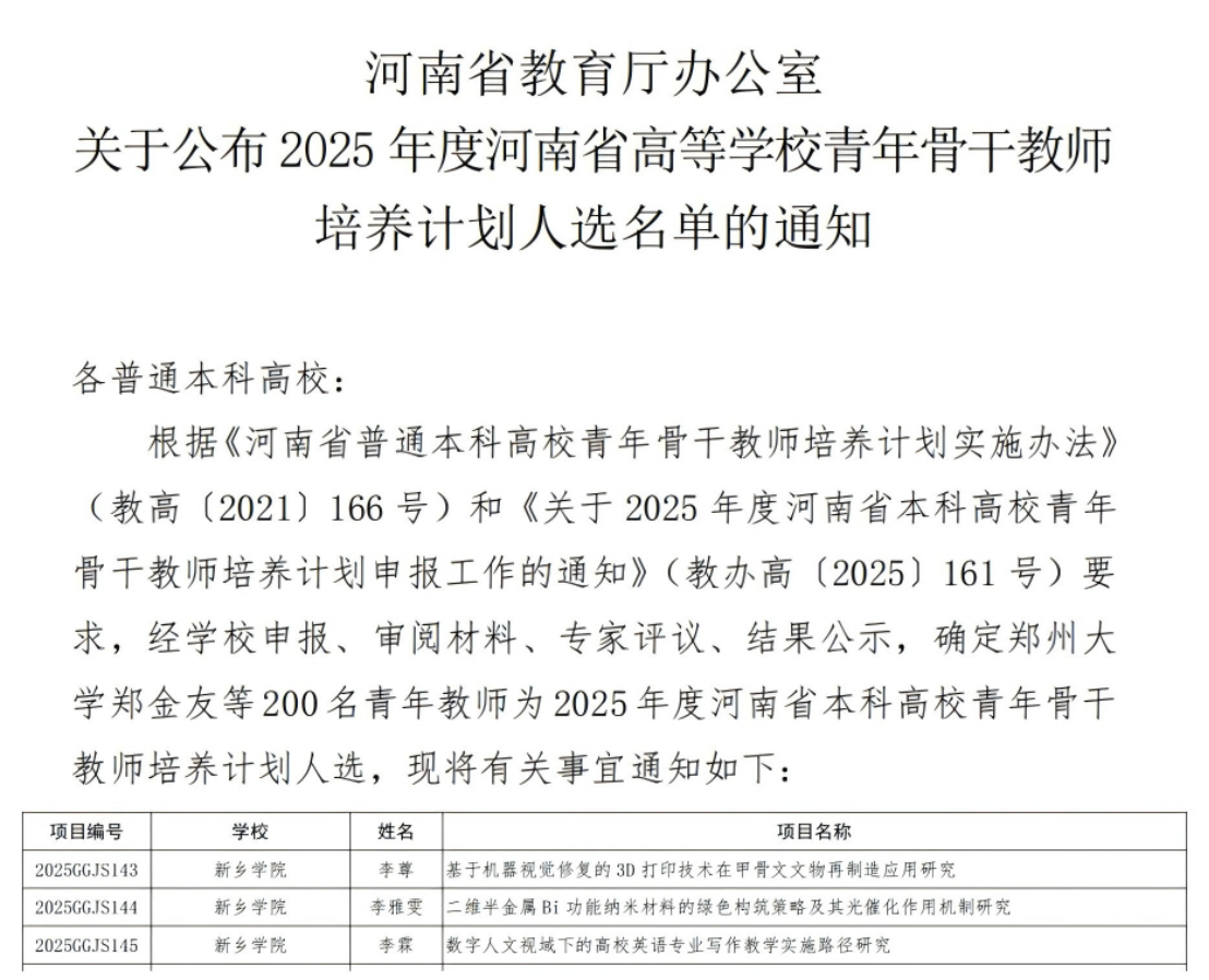 8月22日,河南省教育厅办公室发布《关于公布2025年度河南省高等学校青年骨干教师培养计划人选名单的通知》(教办高〔2025〕217号),正式公布2025年度青年骨干教师培养计划人选名单。经教师申报、学院推荐、学校审核、专家评审及公示程序,yl23411集团官网推荐的李尊、李雅雯、李霖三位青年教师全部入选2025年度河南省高等学校青年骨干教师培养计划人选。