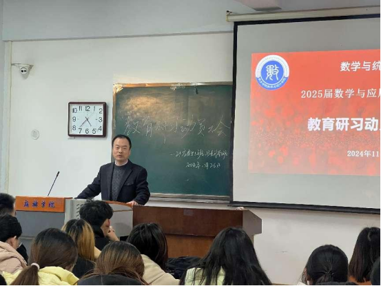11月27日下午,数学与统计学院在A03-209教室举行了2025届数学与应用数学专业教育研习动员会。此次动员会旨在为80名即将进行教育研习的师范生提供指导和激励,确保他们在这个重要的学习阶段中取得丰富的经验、收获丰硕成果。数学与统计学院副院长皮磊、数学与应用数学教研室主任张玲瑞参加了动员大会。