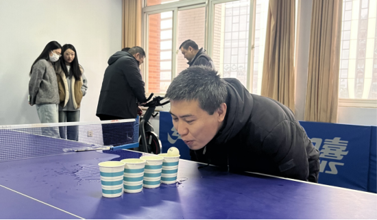 在“杯水传球”项目中, 参赛者在放置的一纵排装满水的杯子前,吹动乒乓球,让球借住气流和水面依次通过每个杯子,用时最短者获胜。大家屏气凝神,小心翼翼的吹动着乒乓球,不敢有丝毫走神。