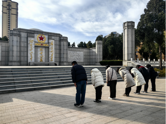 在新乡市烈士陵园,药学院党员教师代表依次缓步环绕四十七烈士纪念墓、英雄墓碑、肖思远和吴志洲烈士塑像、新乡解放纪念碑等进行瞻仰。在烈士公墓前,大家肃穆而立,鞠躬默哀,表达对革命烈士的深切哀悼和无尽的崇敬之情。