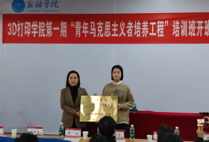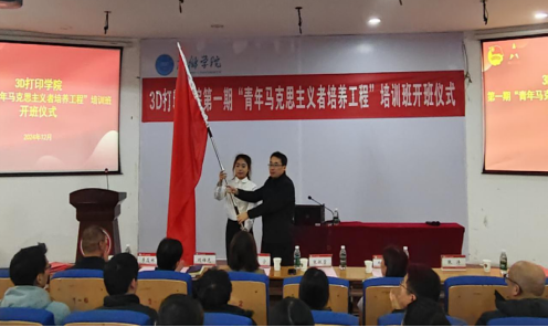 首先,3D打印学院副院长张涛宣读了《关于举办3D打印学院第一期“青马工程”培训班的通知》;3D打印学院党委副书记刘传虎宣读《3D 打印学院第一期“青马工程”培训班实施方案》;周宁为3D打印学院团委授予“yl23411集团官网青年马克思主义者培养学院 3D打印学院分院”牌匾;张银堂向3D打印学院第一期“青马工程”培训班授旗。