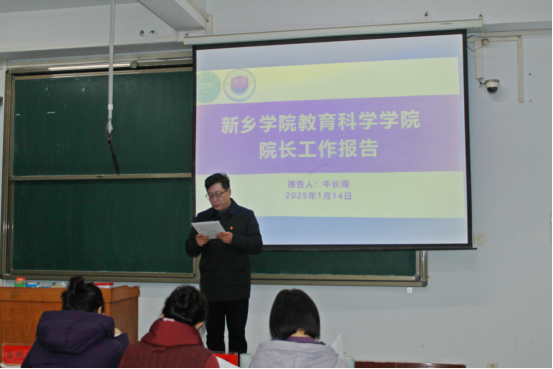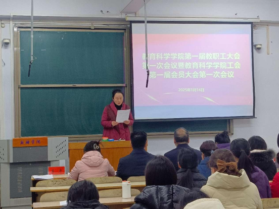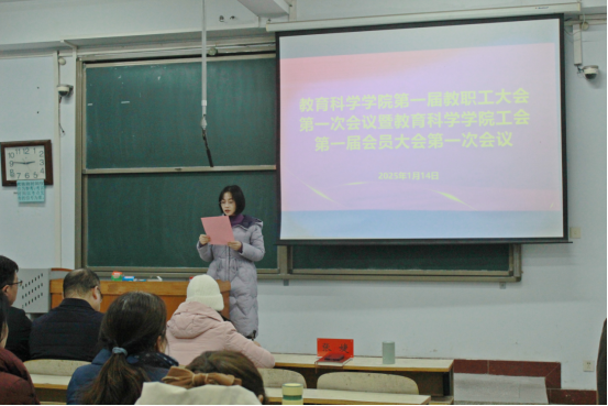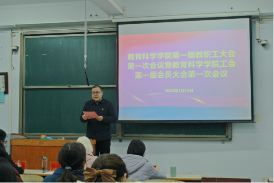 会上,宋华宣读了校工会对召开本次大会请示的批复文件;牛长海向大会作《院长工作报告》,全面回顾了学院2024年的主要工作,总结了学院在党建引领、制度建设、学科专业建设、学位点建设、教学科研、师资队伍、人才培养、服务社会等各方面取得的主要成绩,明确了2025年学院“坚持一个引领,突出四个重点,推进八项工作”的发展思路和主要工作任务,并对本年度教育科学学院及中小学教师校长研修院的经费使用情况进行了汇报;李彦向大会作《工会工作报告》,汇报了2024年教育科学学院分工会在加强师德师风、促进民主建设、重视教师发展、维护职工权益、活动组织开展、公益服务社会等方面开展的工作以及经费使用情况,明确了2025年分工会工作计划。此外,李彦还向大会汇报了本次大会的《提案征集情况报告》。