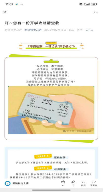 开学前,物理与电子工程学院主要开展了以下三项工作。第一,多渠道发布返校提醒,确保信息全覆盖。为帮助学生提前了解返校安排及注意事项,学院通过多种渠道发布返校提醒。辅导员在班级群中详细说明了返校时间及注意事项,包括交通安全、个人财物安全、宿舍安全及健康管理等要点。同时,学院官方微信公众号发布了开学攻略推文,以图文并茂的形式为学生提供清晰指引,确保每位同学都能及时获取相关信息。通过多渠道发布返校提醒,学院有效实现了返校提醒的全覆盖,确保了信息的及时传达。同学们也表示清晰的返校安排和细致的注意事项帮助他们更好地规划行程,提前做好返校准备。学院也将持续关注学生需求,优化信息发布机制,为学生提供更加便捷、高效的服务。