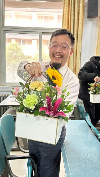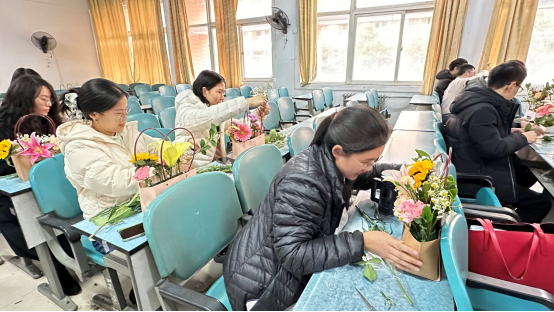 为庆祝第115个国际劳动妇女节,3月4日下午,计算机与信息工程学院分工会在A14-223开展“花艺润生活,巧手绽新彩”三八妇女节主题插花活动。学院全体工会会员参加活动,活动由院党委副书记郭桂花主持,并邀请专业花艺老师进行现场教学指导。