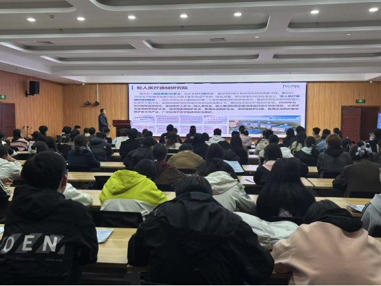 随后鲍胜文进行了企业宣讲,通过视频、PPT等形式从多维展示驼人集团的丰富内涵,全面介绍了企业的发展历程、行业地位及社会责任,重点展示了其在麻醉、护理、3D打印医疗器械等领域的创新成果。经鲍所长宣讲得知,作为国内首家布局全球市场的医疗器械企业,驼人集团现有员工6000余人,拥有60余家子公司及多个研发基地,产品覆盖全球60余个国家和地区。此次招聘面向生物医学工程、材料工程、生物技术、制药工程等专业,提供多元化储备干部岗位300多个。