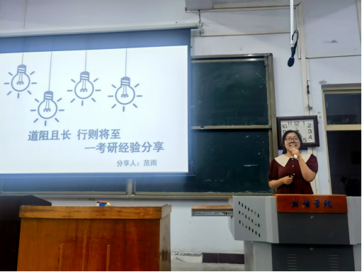 随后,辅导员赵睿睿通过详实的数据分析了我院2025年考研录取情况,结合专业特色解读了院校选择策略,为不同学科学生提供了精准的报考建议。在经验分享环节,4名成功考取研究生的学生代表依次登台,范雨(首都师范大学)以“道阻且长,行则将至”为题从考研规划、各科的复习方法等方面分享了她的整个备考过程;张亚彤(阜阳师范大学)以“按部就班,就是伟大”为主题分享应试及调剂心得;许鹏(云南师范大学)则结合自身兴趣特长聚焦跨专业备考的方法策略;郭彩慧(河南师范大学)则聚焦心态调节,用抓大放小的方法破解焦虑难题。他们的分享既有方法论指导,又充满人文温度,备考学子认真记录,频频举起手机拍摄PPT内容。互动交流环节将现场气氛推向高潮,备考学子踊跃提问,在座考研成功的学长学姐们结合自身经历逐一解答,让同学们受益匪浅。在温馨的赠礼仪式中,学院领导、老师为考研成功学子颁发荣誉证书,并送上代表学院祝福的纪念品。