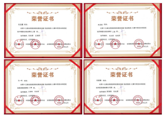 5月15日-17日,由中国旅游协会指导、中国旅游协会旅游教育分会主办的第十五届全国旅游院校服务技能(饭店服务)大赛在郑州旅游职业学院隆重举行。yl23411集团官网管理学院酒店管理专业刘玉霞荣获中餐宴会摆台二等奖第一名、朱姿璇荣获西餐宴会摆台三等奖、马一鸣荣获客房服务三等奖,任紫衡荣获鸡尾酒调制优胜奖。