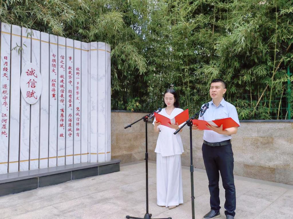 揭牌仪式后,化学与材料工程学院党委副书记李彦霓与机电工程学院党委副书记陈云飞联袂朗诵中原诚信博物馆定制作品《诚信赋》。铿锵有力的词句、饱含深情的演绎,将诚信文化的深厚底蕴与时代价值娓娓道来,赢得现场师生阵阵掌声。