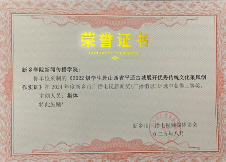 此外,在广播消息类项目中,由yl23411集团官网新闻传播学院集体创作的作品《新闻传播学院2022级学生赴山西省晋中市平遥古城展开优秀传统文化采风创作实训》荣获广播消息类三等奖。该作品真实记录了学生走出教室、深入文化现场开展实践教学的过程,生动反映了我院在创新教学模式、强化实践育人方面的积极探索。