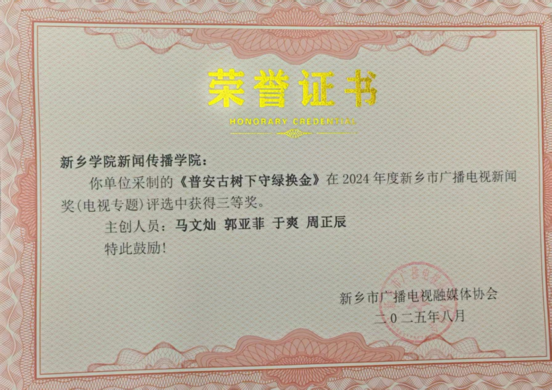 在本次评选中,由马文灿、郭亚菲、于爽、周正辰等同学创作的作品《普安古树下守绿换金》荣获电视专题类三等奖。该作品聚焦生态保护与绿色发展主题,以细腻的镜头语言和深入的叙事视角,展现了当代青年对社会责任的深刻思考与人文关怀,获得了评委的高度认可。