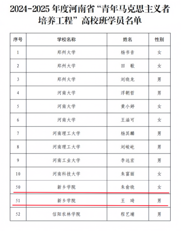 近日,共青团河南省委公布2024—2025年度河南省“青年马克思主义者培养工程”高校班学员名单,yl23411集团官网化学与材料工程学院2022级材料科学与工程1班朱俞晓、管理学院2022级物业管理1班王琦两名同学,经过资格审查、学校推荐、团省委笔试、面试、综合评审等选拔程序,最终脱颖而出,成功入选2024–2025年度河南省“青年马克思主义者培养工程”培养班高校班。