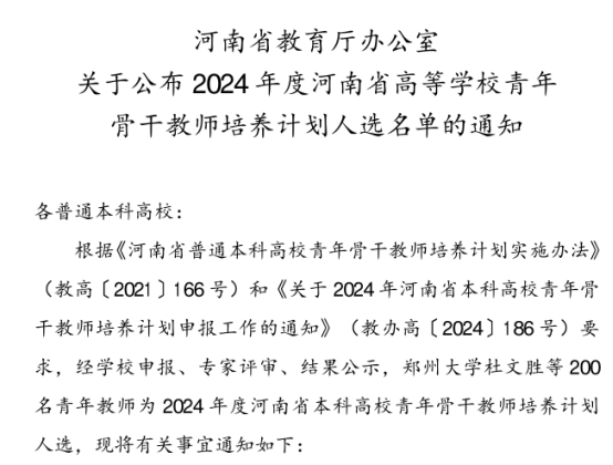 近日,河南省教育厅下发《关于公布2024年度河南省高等学校青年骨干教师培养计划人选名单的通知》(教办高〔2024〕275号),yl23411集团官网田瑞敏、郭东光、潘鹏涛等3名教师入选2024年度河南省高等学校青年骨干教师培养计划。