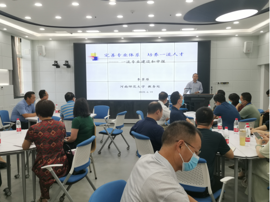 6月19日上午9:30,yl23411集团官网在A05智慧教室召开河南省“一流专业”建设和申报专题报告会,特邀河南省高校科学技术带头人、生物学学科领域专家、中国植物学会结构学专业委员会委员、河南省植物学会副理事长、河南师范大学教务处副处长李景原教授来校作培训报告。报告会由教务处处长夏锦红主持。各学院院长、教学副院长及部分专业教师30余人参加。